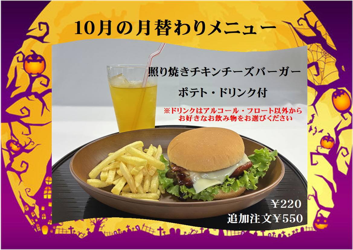 10月の月替わりメニューは 「照り焼きチキンチーズバーガー、ポテト、ドリンク付」…220円 追加注文の場合550円でご提供いたします。 是非ご賞味くださいませ★