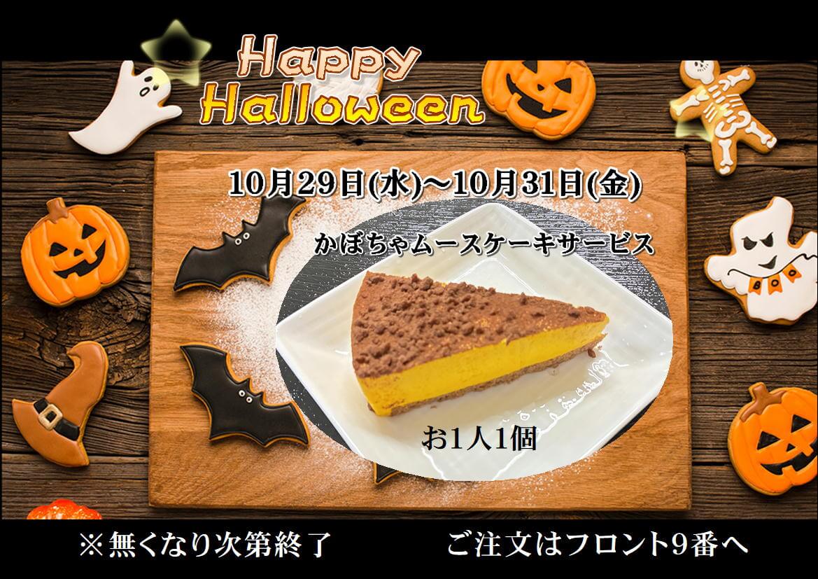 10月29日(水)~31日(金)まで お1人様1個、かぼちゃムースケーキサービス ※無くなり次第終了 ご注文はフロント9番へ